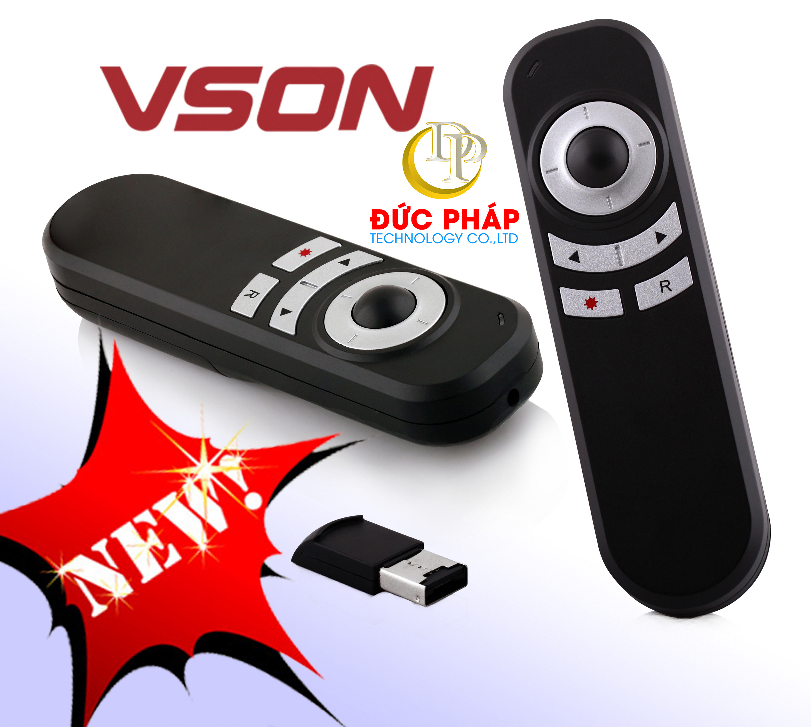 Bút trình chiếu Vson V826 là công cụ tuyệt vời để trình bày PowerPoint, với Vson V826 bạn không cần phải đứng bên cạnh máy tính của mình hoặc có thêm một người bấm vào slide cho bạn. Vson V826 chứa hai phần: máy phát và máy thu USB. Vson V826 có phạm vi tín hiệu tối đa 200m do đó bạn có thể dễ dàng di chuyển và không lo lắng về cường độ tín hiệu. Bạn chỉ cần cắm đầu thu vào cổng USB để bắt đầu thuyết trình. Màu đen tinh tế cùng kiểu dáng nhỏ gọn, nhẹ nhàng, dễ dàng cất giữ, trọng lượng 25 gam (không bao gồm Pin) mang đến cho người dùng cảm giác luôn tự tin và thoải mái khi thuyết trình.
