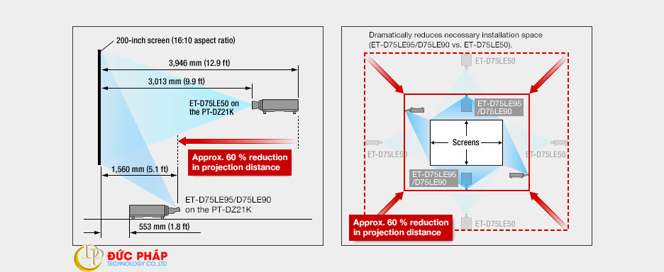 Bằng cách lắp ống kính siêu ngắn ET-D75LE90 lên máy chiếu 3-chip DLP ™ của Panasonic, khoảng cách ném được giảm tới 60% (xấp xỉ) so với ống kính ném ngắn ET-D75LE50. Không gian rộng lớn cho phép người dùng khai thác chất lượng hình ảnh và độ sáng cao được cung cấp bởi máy chiếu 3-chip DLP ™ của Panasonic trong không gian tồn tại những hạn chế trước đây.