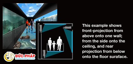 Màn hình thực tế ảo có thể đạt được trong không gian triển lãm nơi khả năng chiếu trước bị hạn chế, do đó làm tăng sức hấp dẫn lên cao. Bạn cũng có thể kết hợp trình chiếu trên tường với các máy chiếu được đặt lên bề mặt sàn hoặc trên trần nhà, bao bọc người xem trong trải nghiệm đồ họa hoàn toàn.