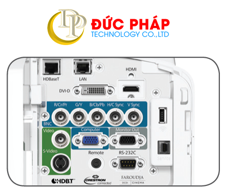 Kết nối: HDBaseT, S-Video in, BNC trong (6x), Component trong, Composite, HDMI, DVI, VGA out, VGA trong, Wireless LAN IEEE 802.11b / g / n (tùy chọn), WLAN, RS-232C, USB 2.0 Loại B (Chỉ Service), USB 1.1 Loại A