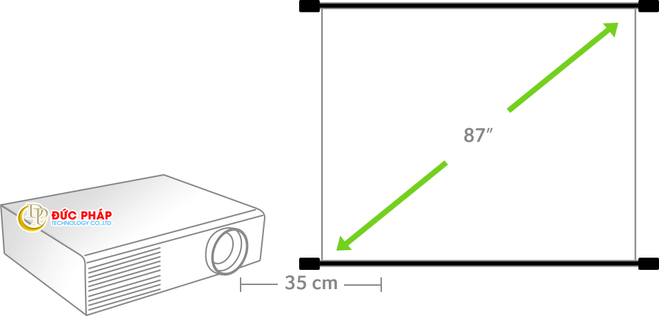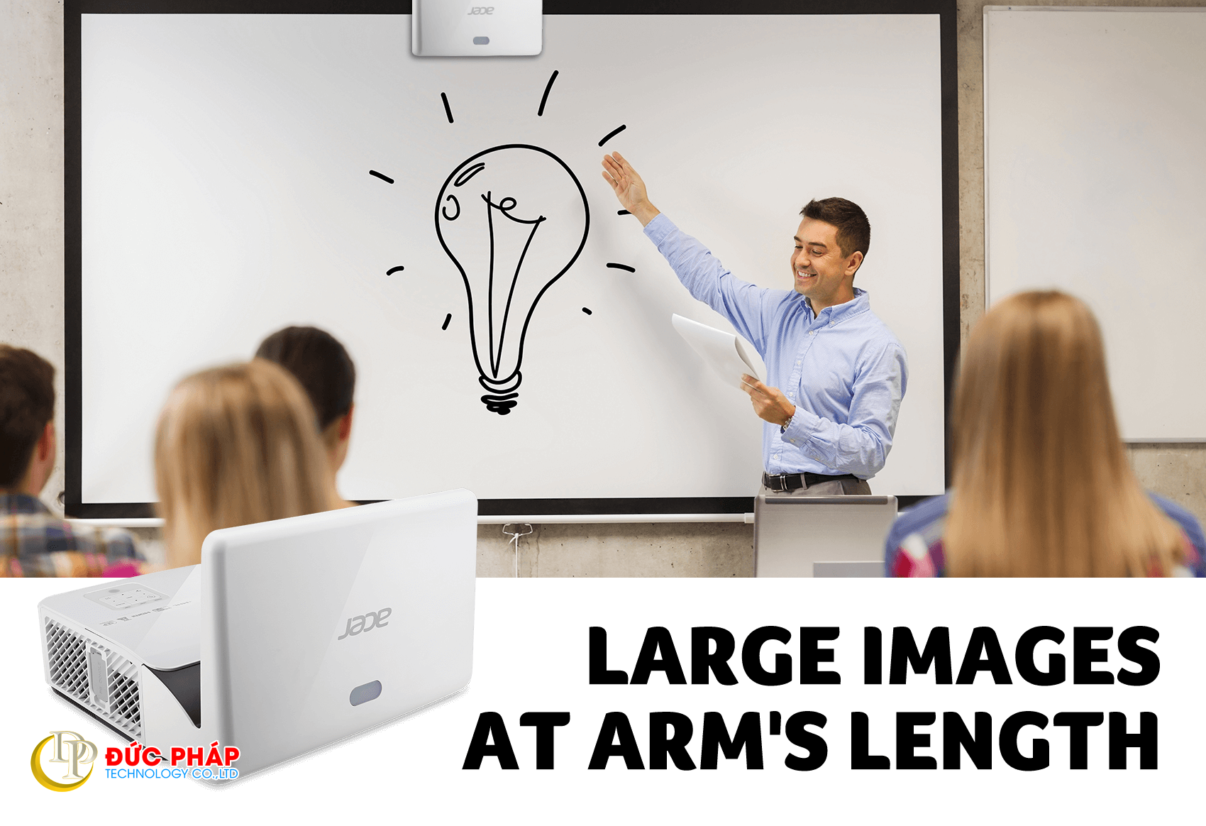 Máy chiếu siêu ngắn được sử dụng cho các phòng nhỏ và lớp học. Từ khoảng cách từ máy chiếu đến màn chiếu chỉ 35 cm, bạn có thể xuất hình ảnh chiếu lên tới 87 inch. Định vị máy chiếu gần màn hình cho phép bạn dễ dàng chỉ ra chi tiết mà không cần đúc bóng hoặc bị rực sáng bởi chùm tia sáng.