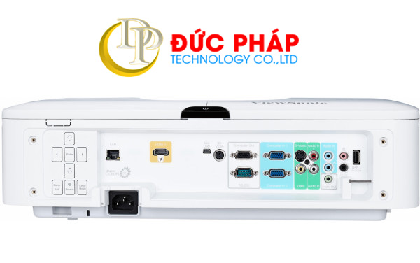 Kết nối: Front IR receiver Lens shift adjustment 1.3X optical zoom 10W x 2 cube Air filter keypad LAN HDMI 4-in-1 power button 3D VESA Monitor out Computer in S-Video Audio in/out IR out Kensington lock Mini USB for service RS232 Video Audio in L/R(RCA) 12V out Security bar Cable management screw hole USB type A (5V/2A)